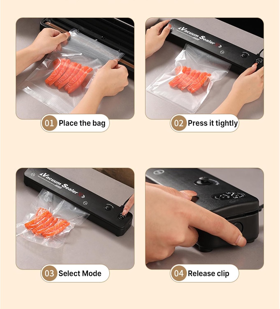 يتميز الجهاز بسهولة الاستخدام—فقط ضع الطعام داخل الكيس الخاص ودعه يقوم بالباقي تلقائيًا. بفضل قدرته 90 واط وتصميمه الخفيف، يمكنك استخدامه يوميًا لتوفير مساحة في الثلاجة ومنع اختلاط الروائح.