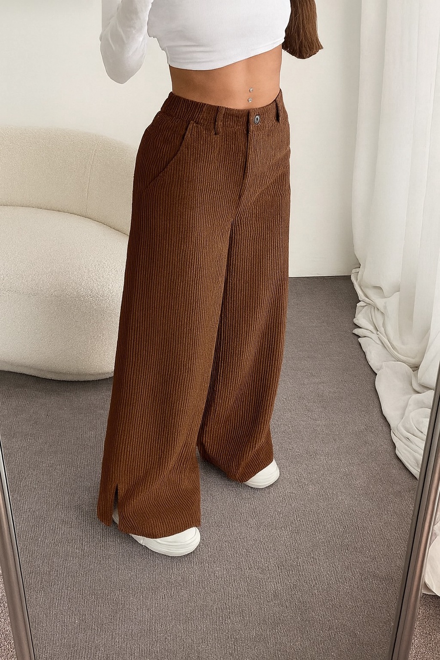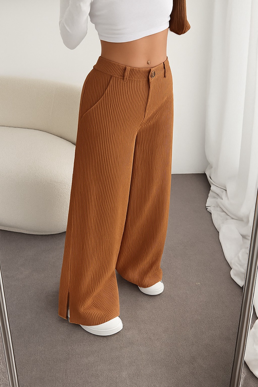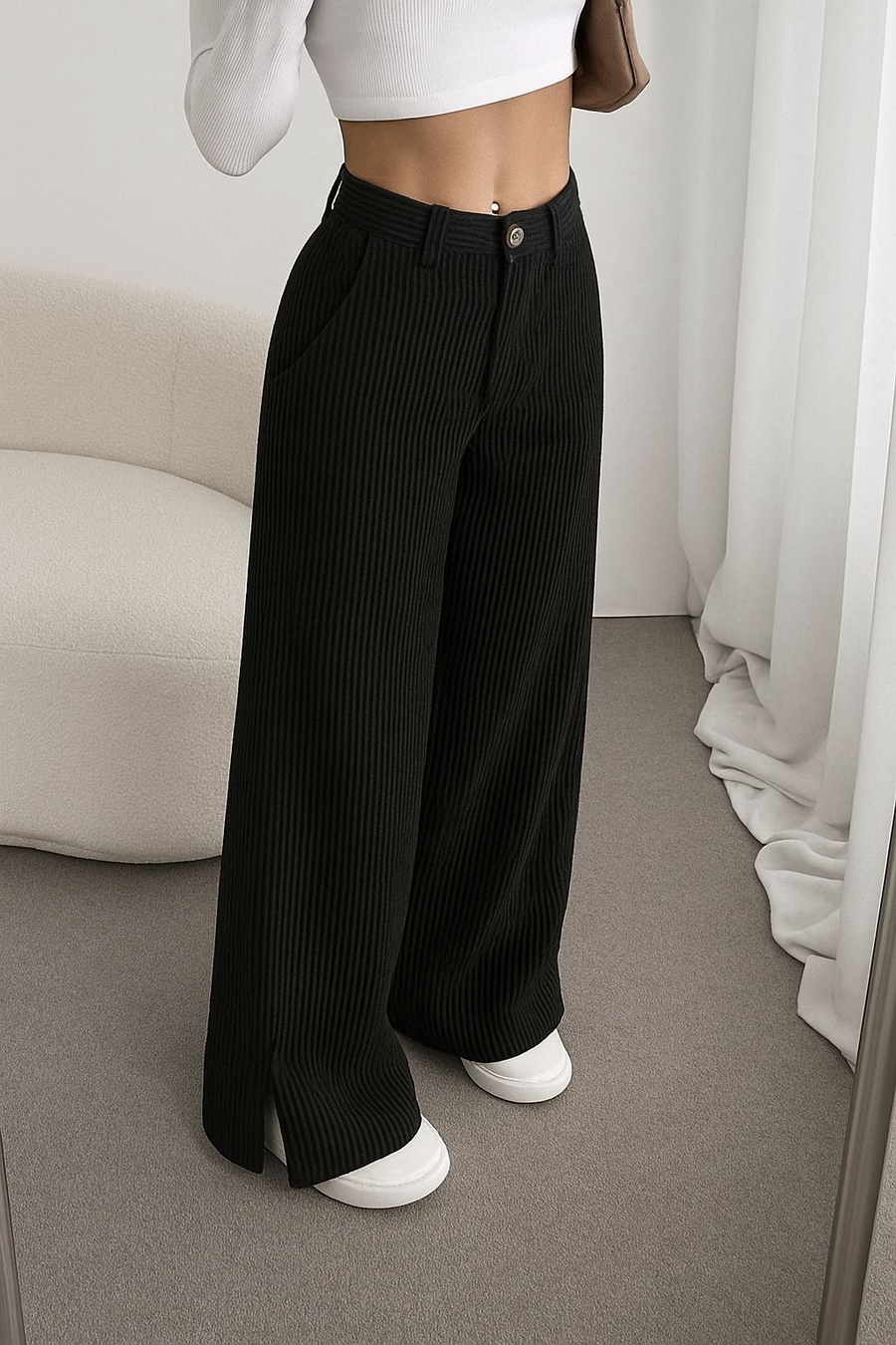 ستعدي لأناقة دافئة ومريحة مع بنطلون القطيفة المضلع وايد ليج — تصميم يجمع بين الستايل العصري والراحة الفائقة لموسم الخريف والشتاء.
